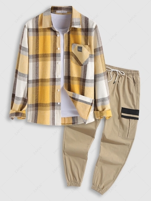Zaful Type: Shirt& Pants Set Style: Casual, Preppy Style, Streetwear Occasions: Daily, Going Out, School Top Length: Regular Sleeves Length: Full Bottom Length: Long Pants Waist Type: Mid Closure Type: Drawstring, Elastic Waist Pattern Type: Colorblock, Plaid Decoration: Patch Designs, Pocket