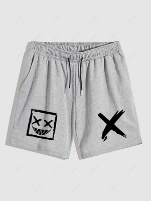 Streetwear Square Face Print Casual Drawstring Shorts M Light Gray