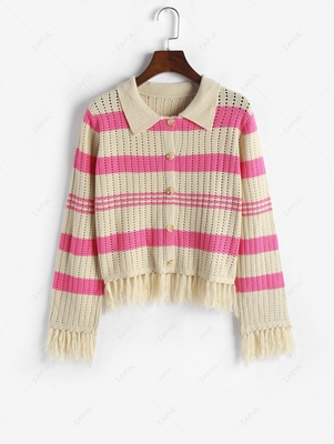 Zaful Type: Cardigans Occasions: Daily Style: Fashion Fit Type: Regular Length: Short Collar: Turn-down Collar Sleeves Length: Long Sleeves Material: Cotton, Polyester Material Stretch: High Stretch Closure Type: Single Button Pattern Type: Striped Decoration: Tassel Thickness: Standard Seasons: Fal