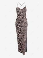 Zaful Style: Cute, Sexy Occasion: Date Night, Going Out, Night Out Silhouette: Sheath Collar-line: Spaghetti Strap Sleeves Length: Sleeveless Dresses Length: Maxi Material: Polyester, Spandex Material Stretch: High Stretch Thickness: Standard Pattern Type: Swirls Decoration: Criss-Cross, Slit Waist: Hig