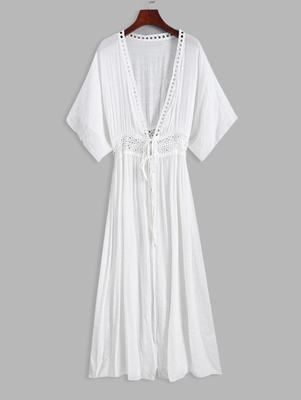 Zaful Cover-Up Type: Kimono Gender: For Women Length: Long Collar-line: Plunging Collar Sleeves Length: 1/2 Sleeves Material: Polyester Pattern Type: Solid Decoration: Lace, Tie Material Stretch: No Stretch Weight: 0.2600kg Package: 1 x Cover Up