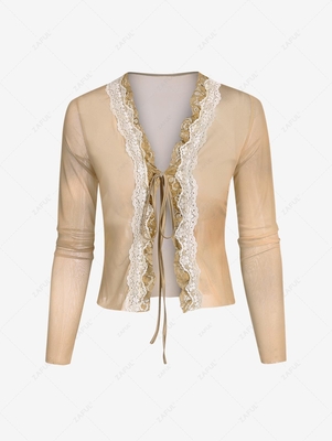 Tie Front Sheer Mesh Lace Trim Top L Coffee