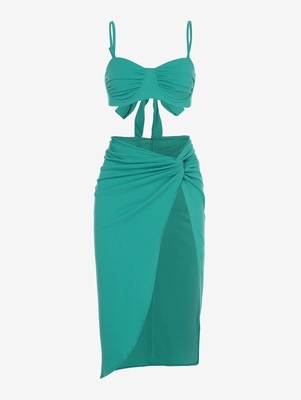 Underwire Bralette And Thigh Slit Twist Skirt Set L Green