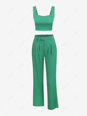 Zaful An elegant & flirty two-piece set is featuring a cropped square-collar top & a pair of wide-leg pants. Add simple heeled sandals to complete a cool, pretty off-duty look. Occasion: Daily Style: Cute Fit Type: Regular Collar-line: Square Collar Sleeves Length: Sleeveless