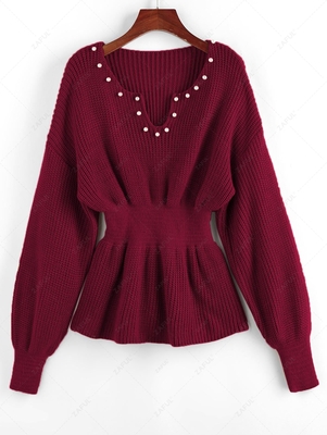 ZAFUL Beading Drop Shoulder Smocked Sweater L Red Wine