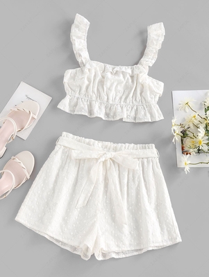 Zaful Perfect for the vacay, this pure co-ord set featuring an allover Broderie Anglaise design has sweet ruffled decoration, as well as a matching waist belt for a better curvy effect. Occasion: Daily, Vacation Style: Casual Fit Type: Loose Collar-line: Straps Sleeves Length: Sleeveless