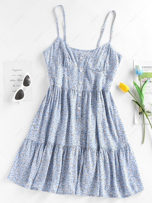 Zaful Cloaked in a bouquet of blooming florals, this sundress is suspended by adjustable spaghetti straps & features a half-button placket & a tiered skirt. Style: Casual Occasion: Daily Silhouette: A-Line Collar-line: Spaghetti Strap Sleeves Length: Sleeveless Dresses Length: Mini