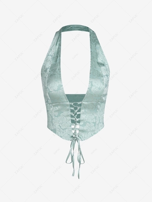 ZAFUL Flower Jacquard Lace Up Halter Tank Top M Light Green