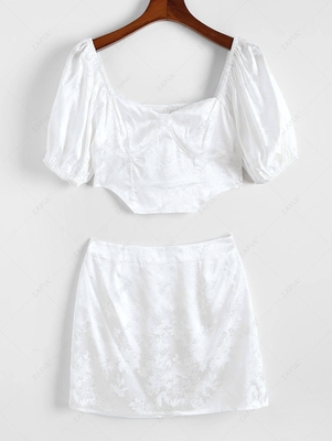 ZAFUL Flower Jacquard Smocked Satin Puff Sleeve Mini Skirt Set Xl