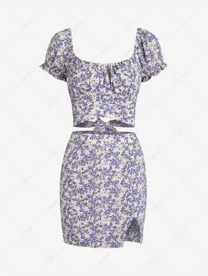 Zaful Give your vacay look a fresh update with this co-ord set which features a feminine tiny floral pattern, lovely puff sleeves, a charming tulip hem with bowknot ties, & an inviting slit detail. Style: Fashion Occasion: Daily, Vacation Fit Type: Regular Silhouette: A Line Collar-line: Scoop Sle
