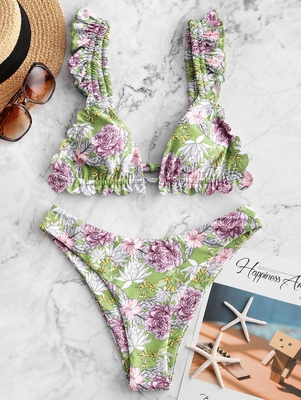 Zaful Dress in this floral pattern bikini swimwear & be flourishing and glow at the beach! Its ruffles accent add much sweet sense, & the high cut leg openings are perfect to show off your shapely legs. Style: Sexy Swimwear Type: Bikini Bikini Type: High Cut Bikini Gender: For Women Materia