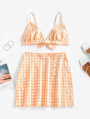 Zaful Stay fresh & look pretty cute in this bright pastel gingham set designed with a bralette top with a self-tie knotted back & slender straps to adjust the fit, & the matching mini skirt is made with an elongating high waist & covered buttons. Occasion: Daily, Vacation Style: Casual, Fashi