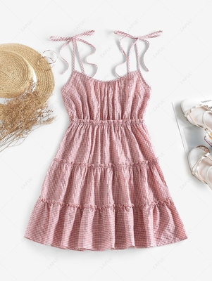 Zaful Slender bowknot ties highlight your pretty shoulders in this gingham summer dress designed in a polished tiered silhouette with frills and ruches for extra sophistication. Style: Casual Occasion: Beach, Day, Vacation Material: Polyester, Rayon Silhouette: A-Line Dress Type: Sundress, Tiered Dress