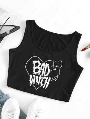 Zaful A cool mix of cat & lettering 'BAD WITCH' graphics make this cropped tank top even more well-suited for Halloween. To complete your look, just add cutoffs or sweat shorts. Style: Cute, Gothic Shirt Length: Crop Top Collar: Scoop Collar