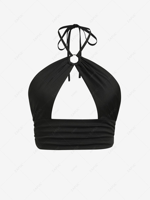 Zaful A geometric cut-out front amps up the flirty style in this curve-flaunting cropped top featuring an adjustable halter collar to tied at the sleek open back & rippled ruches at the waist for an extra sophisticated texture. Style: Fashion Shirt Length: Crop Top Collar: Halter Collar