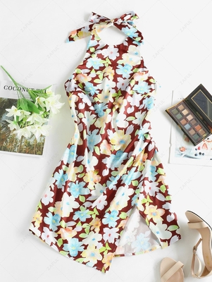 Zaful A brightly colored floral pattern adorns the sweet silhouette of this halter mini dress. Featuring an alluring open back with a cool twist & finished with an overlapping, draped skirt for a creative asymmetrical cut, this piece is an ideal choice for summery special events, just wear with s