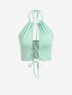 Zaful This striking halter crop top will keep your warm-weather wardrobe feeling flirty with a bold cutout, an on-trend lace-up accent at the front, & an alluring open back. Faded cutoffs & flare trousers are both great go-withs for this mood-boosting piece. Style: Cute, Sexy Shirt Length: Crop