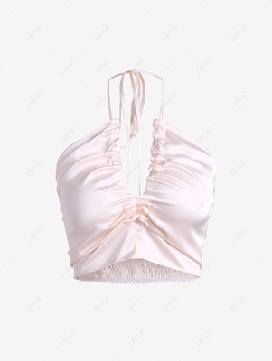 Zaful Add this sweet yet sext piece to your summer wardrobe. This silky top features a plunging collar cinched from a halter tie, a smocked back for a perfect fit, & a cropped hem. It is sure to make you stand out on the party night. Style: Fashion Shirt Length: Short Collar: Halter Collar Materi