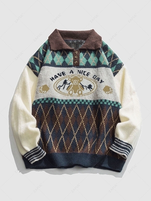 ZAFUL HAVE A NICE DAY Bear Rhombus Pattern Buttons Sweater L Deep