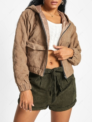 ZAFUL Hooded Corduroy Quilted Pocket Zip Coat S Brown Bear