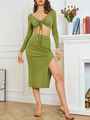 Zaful A soft&cozy jersey knit perfectly hugs your curves in this grass-hued matching set designed with a long-sleeve crop top that ties at the front and a slinky midi skirt with a high split for easy movements. Occasion: Daily, Going Out Style: Fashion, Sexy Fit Type: Skinny Silhouette: Bodycon Colla