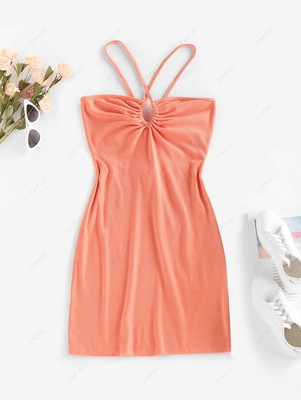 Zaful Ribbed for texture & shaping, this figure-hugging dress is detailed further with cross-over straps to the front & a sultry cutout back for a peek of skins. Style: Sexy Occasion: Daily Silhouette: Bodycon Collar-line: Keyhole Collar Sleeves Length: Sleeveless Dresses Length: Mini