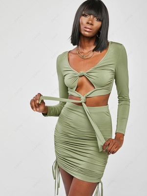 Zaful Hug your every-inch figure, this two-piece comprises a crop top with dual central knots & cutout plus a mini skirt that's cinched further with ruching at the sides. Occasion: Daily, Going Out Style: Sexy Fit Type: Slim Silhouette: Bodycon Collar-line: V Collar Sleeves Length: Long Sleeves Ma