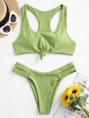 Zaful Detailed with a subtle, ribbed texture, the top is constructed with a racerback so you can freely move your arms & detailed with a shape-cinching knot at the front, & the bottoms are accented by cut-outs at the sides that draw the eye to your waist. Style: Sport Swimwear Type: Bikini Biki