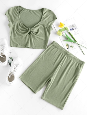 Zaful A polished take on an athleisure outfit, this sleek shorts set is cut from a soft ribbed knit & features a knotted top & matching biker shorts to make for an ideal outfit for easy weekends or just lounging around. Occasion: Daily, Night Out Style: Casual Fit Type: Slim Collar-line: Sweethe
