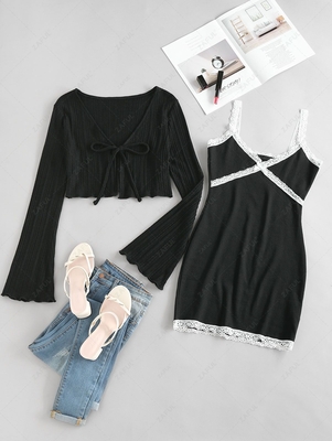 Zaful This slinky dress makes a difference with the contrasting lace inserts, & decorative bowknot. While the tie-front bell sleeve cardigan keeps the dress work on chilly days. Style: Sexy Occasion: Daily, Date Night
