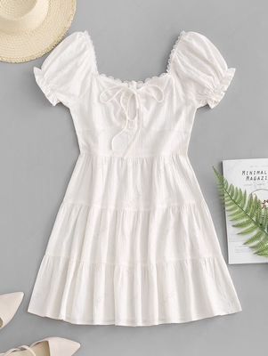 Zaful Spun from pure cotton to an A-line silhouette, it’s framed by short puffed-up sleeves, lace trims, ties at the center of the bust, & a tiered bottom. As for styling? We're thinking of chunky Mary Jane shoes. Style: Cute Occasion: Daily, Vacation Silhouette: A-Line Collar-line: Sweetheart C