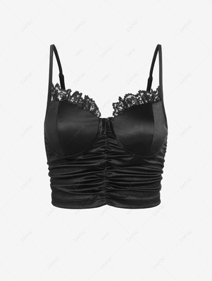 Zaful A feminine take on a simple cami top, which is crafted from soft silky fabric with intricate lace trims at the collarline & features an alluring bustier-style bodice with ruching that accentuates its slim-fitting silhouette. Style: Cute Shirt Length: Crop Top Collar: Spaghetti Strap Materia