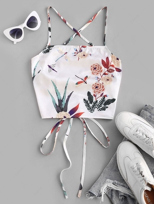 Zaful Add a theme of feminine chic with this pretty print top. Designed with an open back with a lace-up design & an alluring cropped length, it's all in the elevated elements. Style: Fashion Shirt Length: Short Collar: Spaghetti Strap