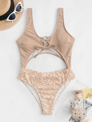 Zaful This ribbed one-piece swimsuit in a flirty silhouette is updated with a lace-up front, bold, alluring cutouts, & spotted-print panels for a fun half-&-half look. Pair this simple stunner with a sun hat & straw tote for a day poolside. Style: Cute Gender: For Women