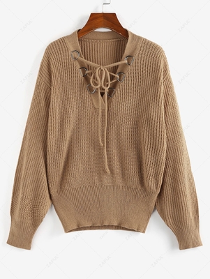 ZAFUL Lace Up Drop Shoulder V Neck Sweater L Coffee
