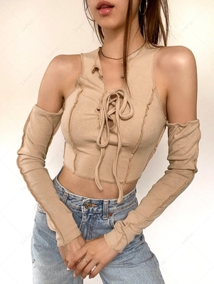 Zaful An exaggerated cold-shoulder cutout amps up the flirty style of this cropped long-sleeve T-shirt cut from a stretch ribbed fabric & fashioned with lace-up straps, contrast topstitching details, & sporty thumbhole details. Style: Fashion Occasions: Daily Shirt Length: Crop Top Collar: Roun