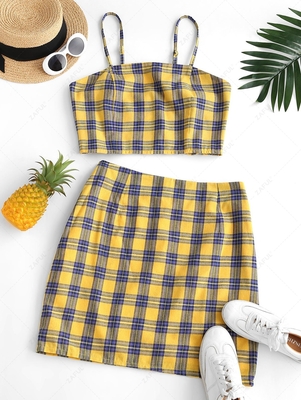 Zaful Cloaked in a vivid checked print, this two-piece dress comprises a cami top with adjustable shoulder straps & a smocked back, & a pair of miniskirts. It's ready to be slipped on with strappy sandals, stilettos, & trainers till your heart's desire. Occasion: Daily, Vacation Style: Cute Fi