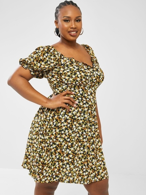 ZAFUL Plus Size Ditsy Floral Puff Sleeve Shirred Back Nap Dress