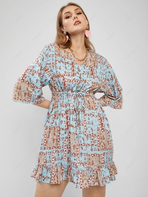 ZAFUL Plus Size Ethnic Patchwork Print Waist Drawstring Ruffle Dress