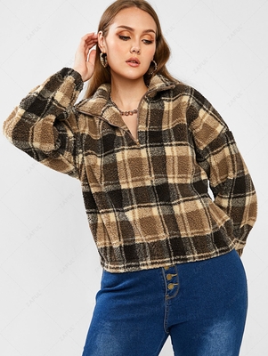 ZAFUL Plus Size Half Zip Plaid Teddy Sweatshirt