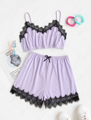 Zaful Snuggle up in this flirty lilac set featuring a cropped camisole with an eyelash lace trim, adjustable shoulder straps, and matching shorts with a satin bow accent and lace hem. Style: Cute Occasions: Daily Type: Shorts Set Material: Polyester, Polyurethane Collar-line: Spaghetti Straps Sleeve