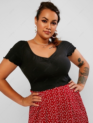 Zaful Turn on the charm in this soft & cozy cropped top cut from a stretchy ribbed knit with adorable lettuce trims, a V-collarline, & ruched details to show off the timeless classic glams.