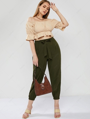 Zaful Perfectly mix & match that can be easy to team up with your favorite pieces solely, this sassy set features a peplum-liked ruffle top with a convertible collar, which can be worn as a flaunting off-the-shoulder or just a classic round collar, & the belted pants are designed with a high wa