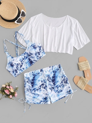 Zaful Hit the beach & make a stunning splash in this three-piece swimsuit featuring a cross-back cropped top, a pair of cinched-side shorts, & a sheer mesh top to get you ready for a beach stroll. A sea wave print grabs eyes the moment you show up at the beach. Style: Fashion Swimwear Type: Thr