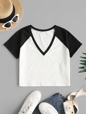 Zaful Creating an easy-going look with this tee. This cute tee features a V collarline, black short raglan sleeves, and white fitted bodice with a cropped hem. Pair it with denim and sneakers for a simple day look. Style: Casual Occasions: Daily Collar: V-Collar Sleeves Length: Short Fit Type: Regu