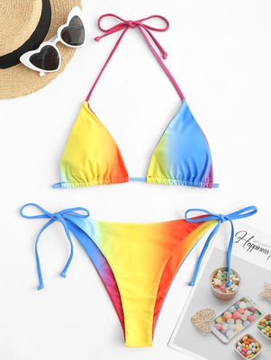 Zaful Add this bikini swimwear to your vacay look. Featuring an eye-catching rainbow design with triangular cups & bowknot tie straps, the set completes well with sunnies for a totally dreamy look. Style: Sexy Swimwear Type: Bikini Bikini Type: Cheeky Bikini, String Bikini, Upside Down Bikini Gende