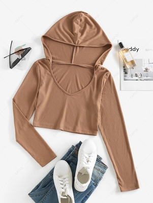 ZAFUL Ribbed Hooded Slim Crop Tee S Coffee