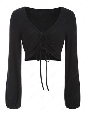 Zaful This crop top crafting from a cozy ribbed fabric has an alluring plunging collarline, a large cutout with a bowknot tie closure, & a slim fit. Matches with high-waisted jeans for a terrific look. Style: Sexy Occasions: Daily Shirt Length: Crop Top Collar: Plunging Collar Sleeve Type: Lanter
