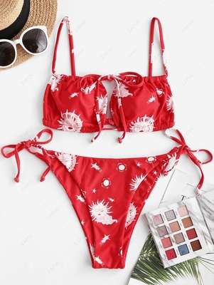 Zaful Crafted from a soft ribbed fabric, this string bikini swimwear is printed with an allover sun and stars pattern which is now in fashion. The keyhole design is secured with the help of the drawstring which is adjustable. The briefs have self-tie sides for a more comfortable fit, and have high